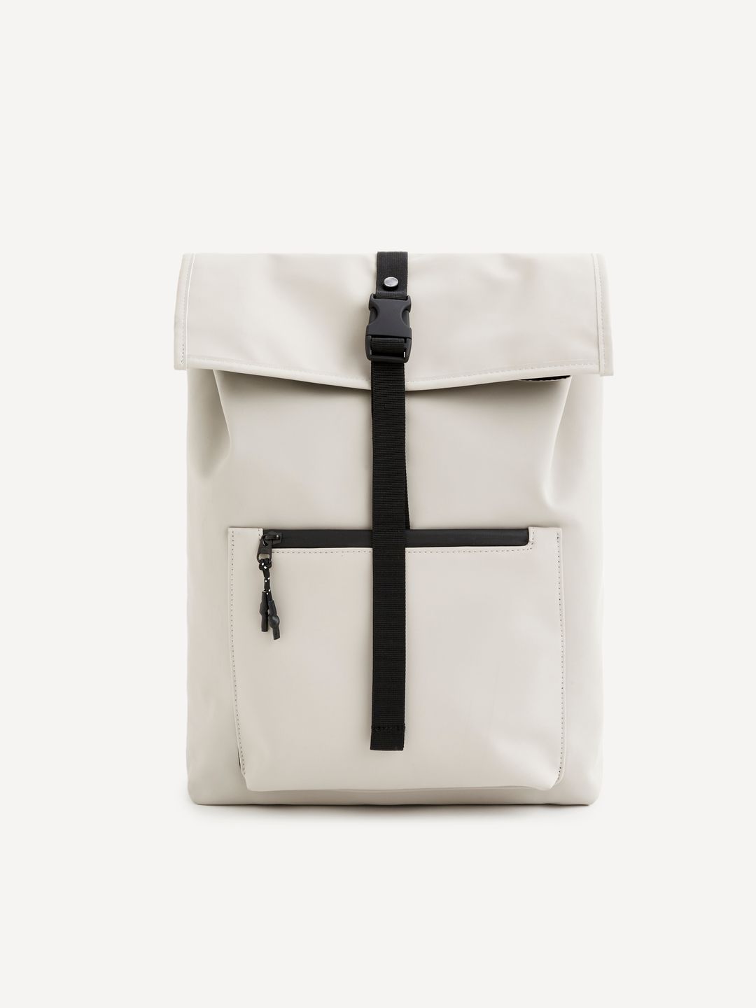 Batoh na záda z voděodolného materiálu. Ramenní popruhy lze nastavit. Tento moderní batoh má v horní části širokou klopu se zapínáním na přezku a přední kapsa na zip.