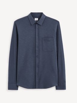 Bavlněná košile s dlouhým rukávem. Límeček a zapínání na knoflíčky. Na hrudi našitá malá kapsa. Zaoblený spodní lem.