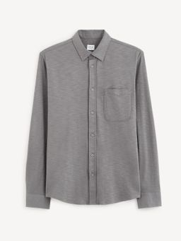 Bavlněná košile s dlouhým rukávem. Límeček a zapínání na knoflíčky. Na hrudi našitá malá kapsa. Zaoblený spodní lem.