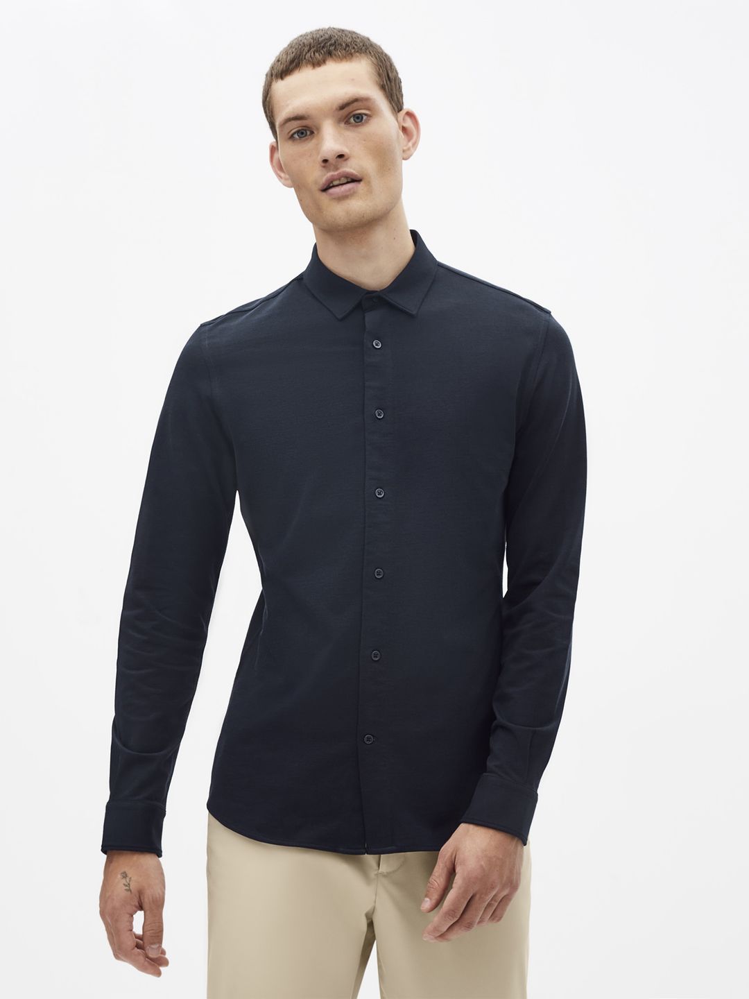 Přiléhavá košile slim. Moderní krátký límeček. Zapínání na knoflíčky. Dlouhé rukávy s manžetou. Drobná reliéfní struktura piké.