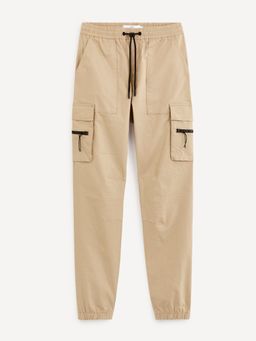 Bavlněné kalhoty s elastanem. Pružný pas se stahovací šňůrkou a velké kapsy s klopou a na zip. Pružné manžety. Pohodlné a praktické kalhoty pro volný čas.