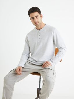 Bavlněné jednobarevné tričko s dlouhým rukávem. Kulatý výstřih se zapínáním na knoflíčky. Příjemné a pohodlné tričko si rychle oblíbíte a bude se vám dobře nosit.