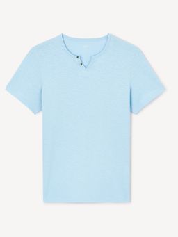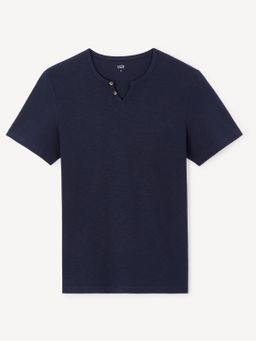 Elegantní, bavlněné pánské tričko pro každou příležitost. Žíhané tričko v modré barvě s rovným střihem, krátkými rukávy a výstřihem do "Vé" se zapínáním na 2 knoflíčky.