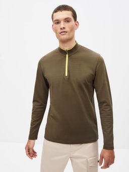 Hladké bavlněné polo tričko se stojáčkem u krku a zapínáním na zip. Dlouhé rukávy a rovný střih.