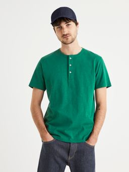 Jednobarevné bavlněné tričko se zapínáním na knoflíčky u krku. Krátký rukáv a kulatý výstřih.