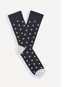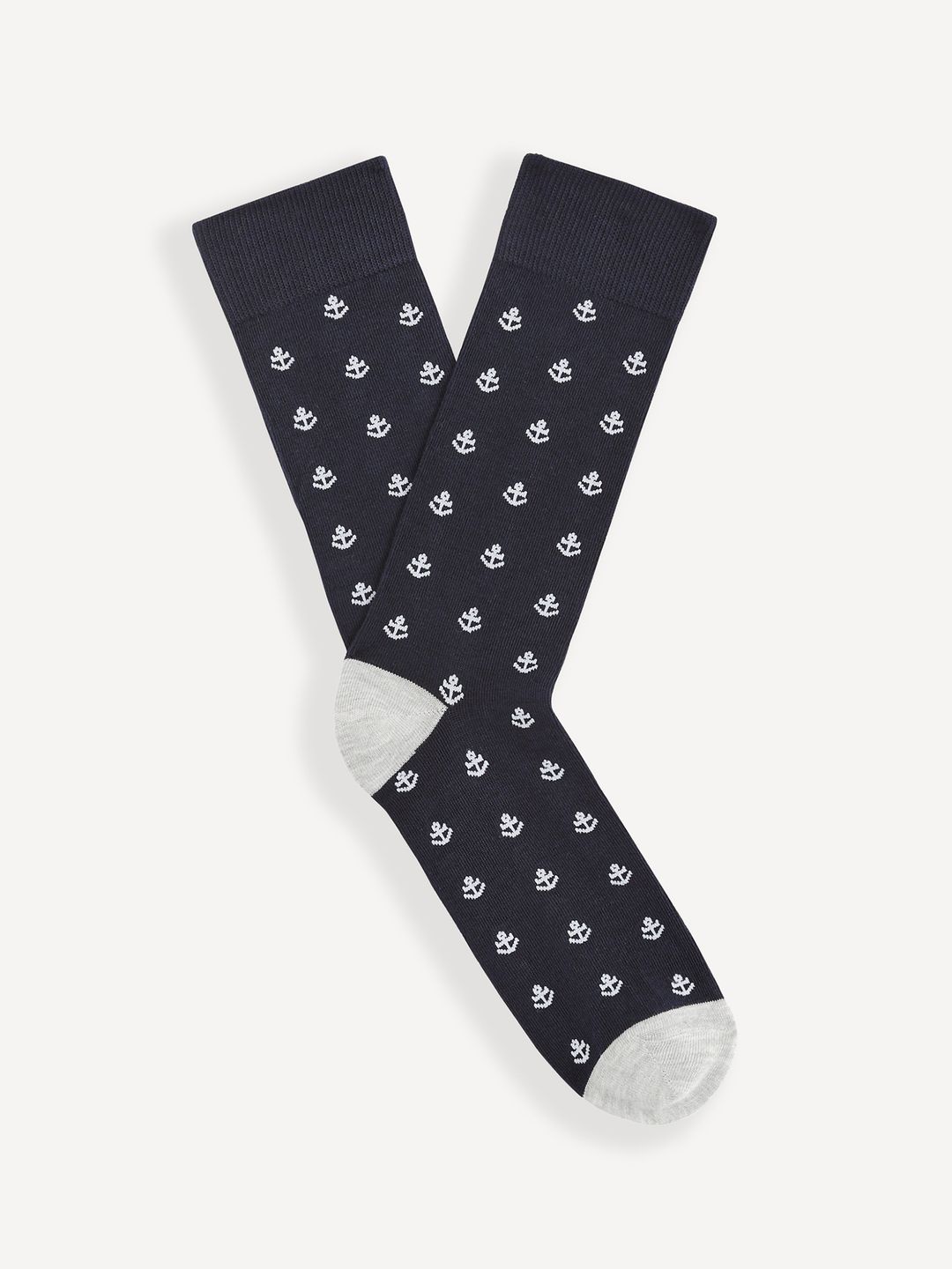 Bavlněné vysoké ponožky. Drobný vzor. Zesílená špička i pata v kontrastní barvě. Hladce pletené s pružným lemem.