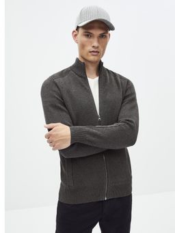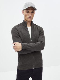 Bavlněný kardigan s vysokým límcem. Po celé délce zapínání na zip. Šikmé přední kapsy. Pružné pletené náplety.