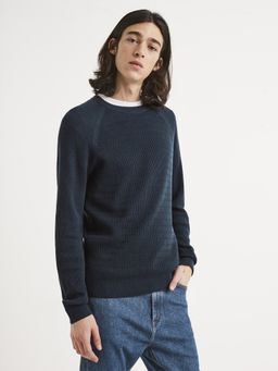 Pletený svetr s kulatým výstřihem. Širší pružné náplety.