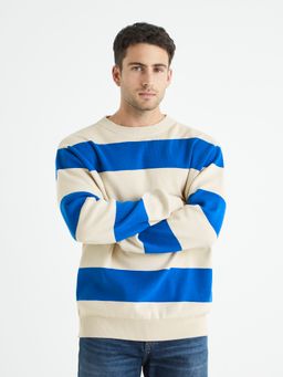 Moderní svetr s pruhy v béžové a modré barvě. 100% bavlněný úplet. Kulatý výstřih a pružné náplety. Skvěle doplní světlé džíny a bílé tenisky.