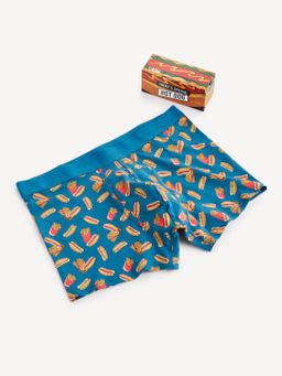 Bavlněné boxerky v dárkovém balení. Plošný vzor a pružný pas. Papírová krabička s potiskem Hot Dog.
