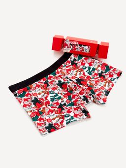 Vánoční bavlněné boxerky s elastanem. Plošný barevný vzor a pružný pas. Ozdobná papírová krabička.