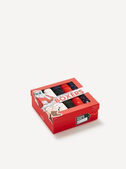 Bavlněné boxerky s elastanem ve vánočním dárkovém balení. Celkem 5 kusů. Různé barvy a vzory, pružný pas. Ozdobná papírová krabička.