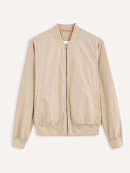 Bunda bomber v béžové barvě. Klasický střih do pasu se zapínáním na zip. Dlouhé rukávy s pružným nápletem. Přední šikmé kapsy. Kulatý výstřih s pružným lemem. Lehká bunda s podšívkou.