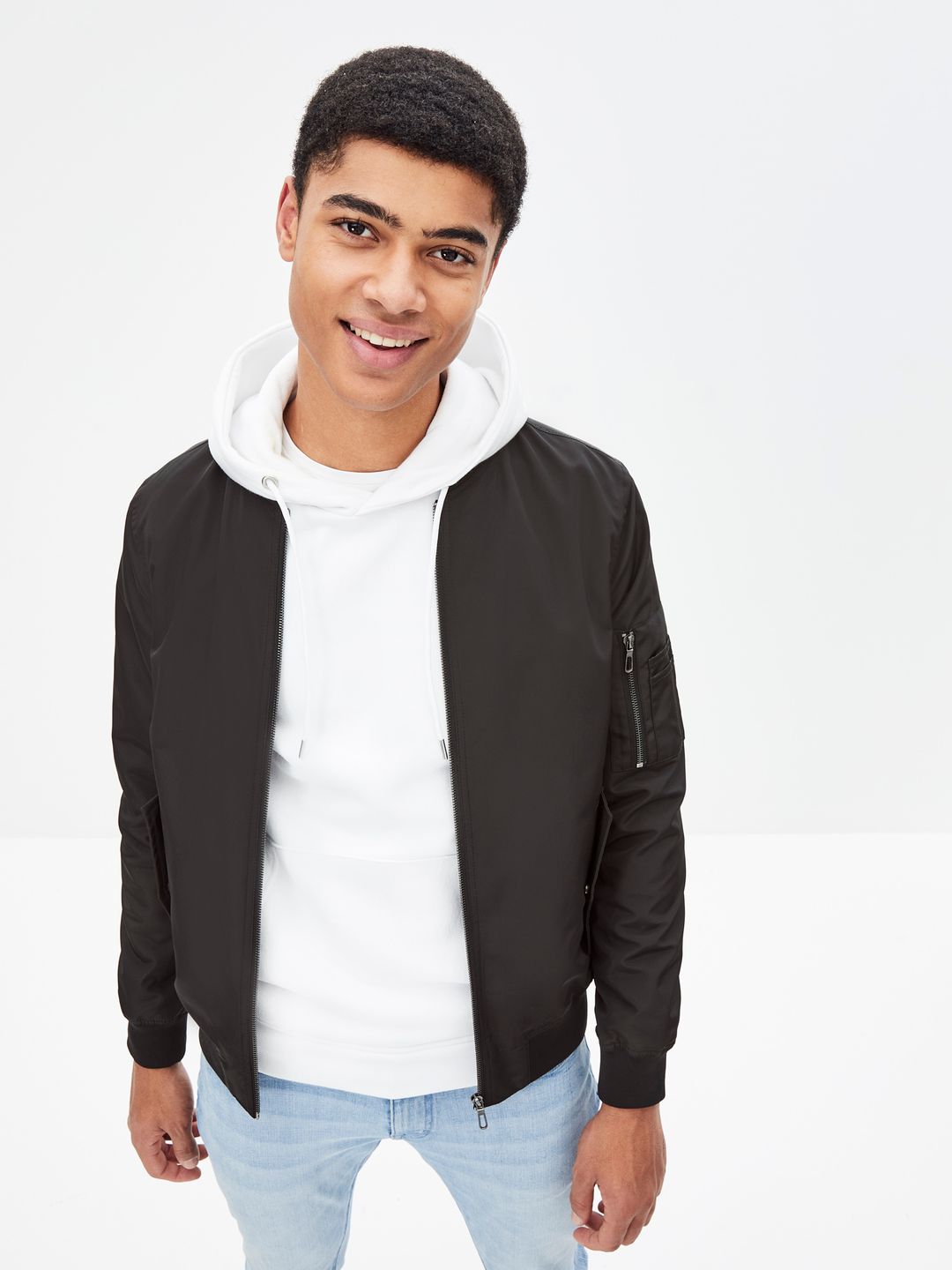 Oblíbená bunda bomber v černé barvě. Se zapínáním na zip. Boční kapsy s klopou. Na levém rukávu kapsička na zip. Bunda má pružné náplety a nejlépe se hodí k džínům a bílému tričku.