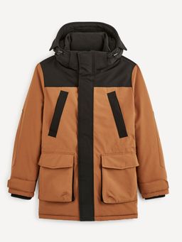 Dvoubarevná zimní parka s kapucí. Vrchní vrstva je vodoodpudivá. U krku vysoký stojáček. Kapuce je zateplena kožíškem z umělého beránka. Zapíná se na zip a má krycí klopu na suchý zip. Dvě šikmé náprsní kapsy na zip a dvě velké kapsy s klopou. Bundu lze v pase na vnitřní straně stáhnout.