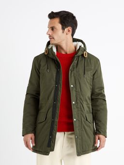 Pánská parka má kapuci podšitou umělým beránkem a stahovací šňůru. Vysoký límec a zapínání kombinující zip s krycí klopou náležitě ochrání před chladem. Má také mnoho vnějších kapes a jednu vnitřní pro praktické každodenní použití. Její tkanina je vodoodpudivá, aby odolala dešti a bunda je vycpaná recyklovaným polyesterem. Doplní každý outfit, hodí se do práce i na volný čas.