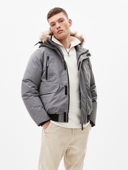 Zateplená kratší bunda se zapínáním na zip. Široká krycí klopa zipu na suchý zip. Velké přední kapsy s klopami. Dvě náprsní kapsy na zip. Kapuce s vysokým límcem a umělou odepínací kožešinkou. Široké a pružné náplety.