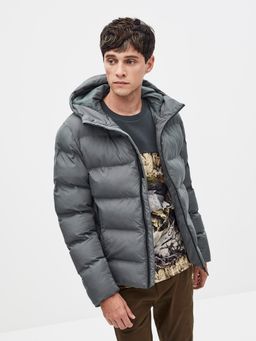 Šedá zimní prošívaná bunda. Kapuce s vysokým límcem. Zapínání na zip. Šikmé boční kapsy na zip. Skrytá vnitřní kapsa na zip. Hřejivý model.