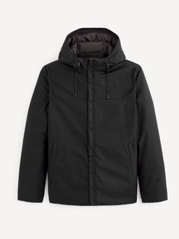 Jednobarevná zateplená bunda s kapucí. Vysoký límec chrání krk před chladem. Stahovací šňůrka k regulaci kapuce. Šikmé boční kapsy a rovný střih.