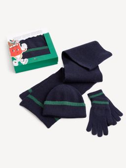 Čepice, šála a prstové rukavice v dárkovém balení. Hřejivá měkká pletenina s drobným žebrováním. V modré barvě se zeleným pruhem. Dárková krabička s vánočním motivem.