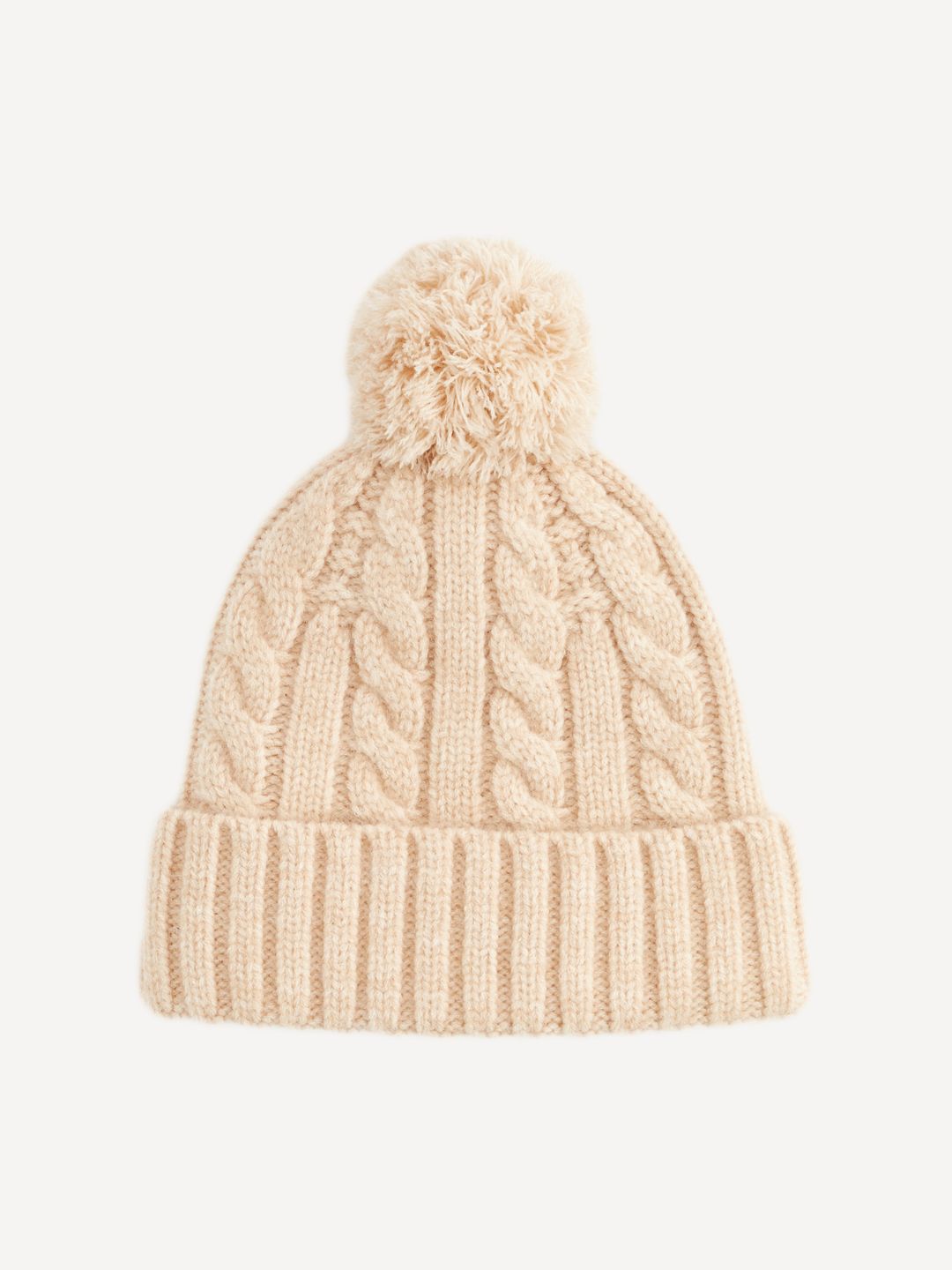 Hřejivá pletená zimní čepice s bambulí a copánkovým vzorem. Přes uši zesílený ohrnutý lem. Příjemný materiál.