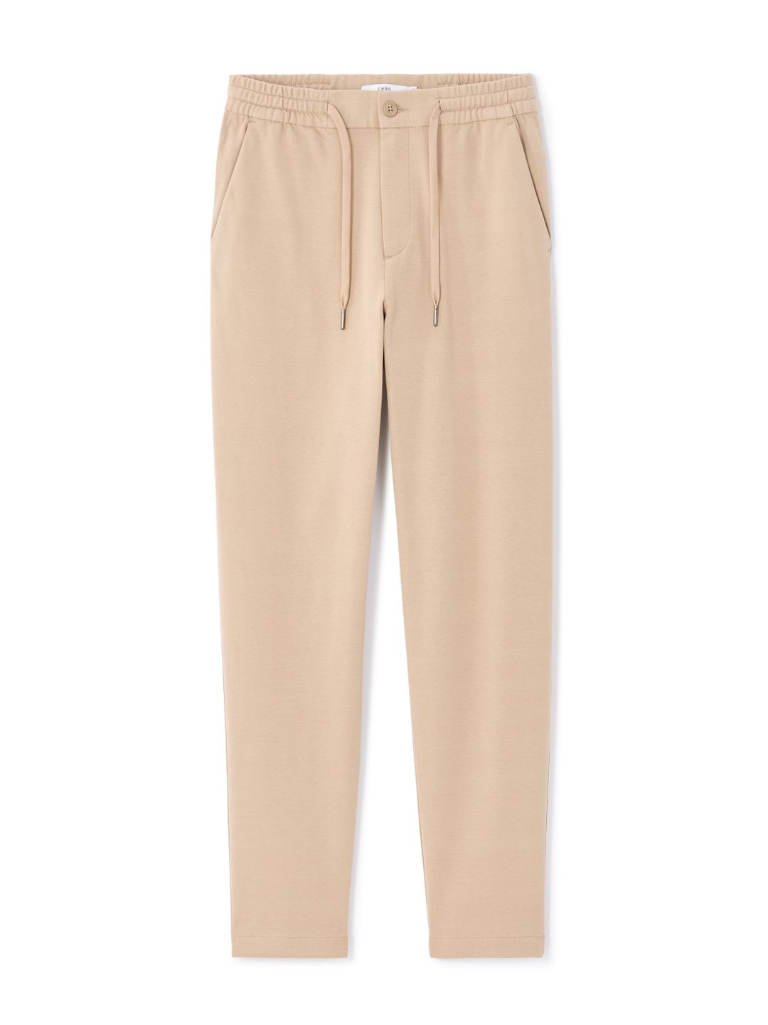 Tyhle béžové chino kalhoty z pleteného materiálu spojují ležérní styl s každodenním komfortem. Slim střih drží čistou siluetu, zapínání na zip a knoflík doplňuje stahovací šňůrka pro větší pohodlí. Nechybí boční kapsy v italském stylu ani zadní kapsy s lemováním.