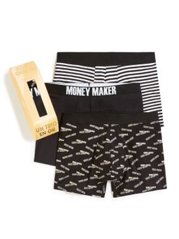 Daruj originální dárek sady 3 pánských boxerek s vánočními motivy dolarů! Set je uložený ve vánoční dárkové krabičce ve tvaru ingotu, což mu dodává luxusní vzhled. Boxerky v černé barvě s hladkými i pruhovanými vzory zajišťují styl a také pohodlí, díky strečové bavlně a elastickému pasu!