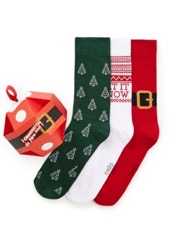 Udělej radost s touto stylovou sadou pánských vánočních vysokých ponožek. Balení obsahuje tři páry červených ponožek se svátečními motivy, vše krásně zabaleno ve vánoční krabičce ve tvaru Santa Clause. Ponožky jsou z měkké bavlněné směsi, která poskytuje příjemný pocit po celý den.