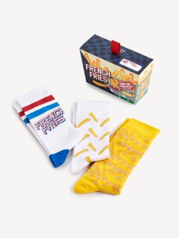 Dárkové balení pánských ponožek. V balení celkem 3 páry. Různé barvy a vzory. Zesílená špička i pata. Pružný žebrovaný lem. Ozdobná papírová krabička.