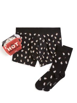Daruj vánoční dárek s tímto originálním setem pánských boxerek a ponožek. V dárkové krabičce ve tvaru horké čokolády najdeš černé boxerky a ponožky s veselými motivy šálků horké čokolády. Díky pohodlnému elastickému pasu a strečové bavlně tento set nabízí komfort, který vydrží po celý den.