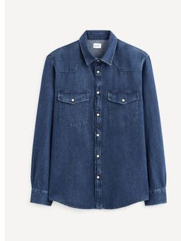 Bavlněná džínová košile. Dlouhé rukávy s manžetou. U krku límeček a kapsy s klopami.
