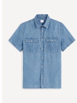 Džínová moderní košile s krátkým rukávem. Bavlněná s límečekem u krku. Se zapínáním na patentky. Na hrudi dvě kapsy s klopou.