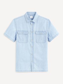 Džínová moderní košile s krátkým rukávem. Bavlněná s límečekem u krku. Se zapínáním na patentky. Na hrudi dvě kapsy s klopou.