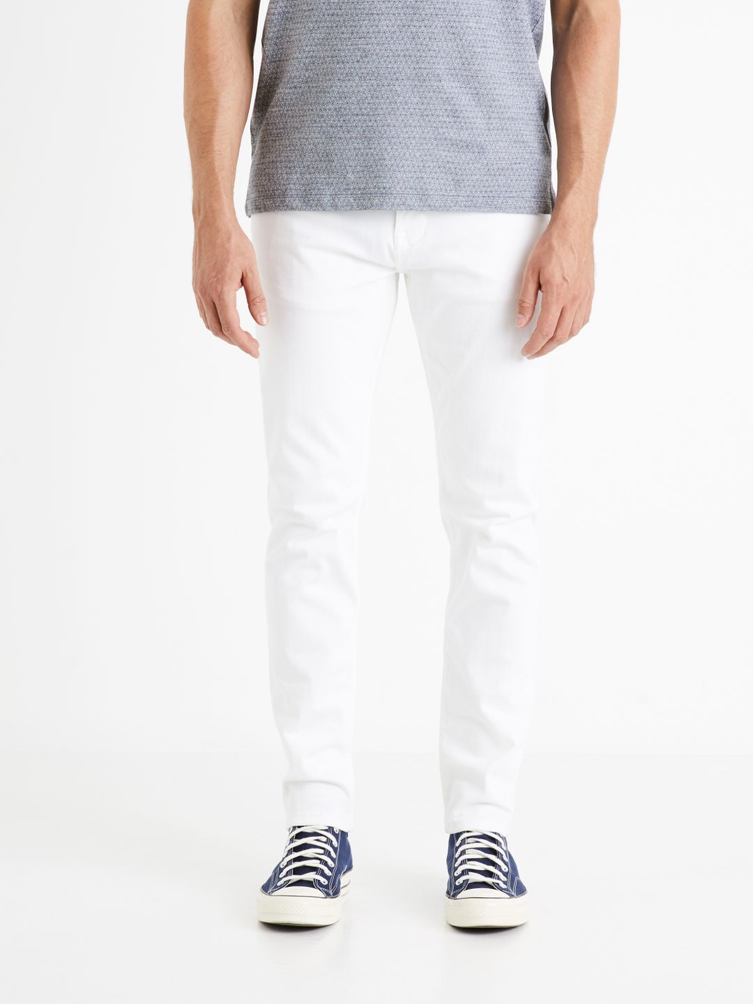 Slim střih džínů je úzký. Materiál je strečová bavlna, která skvěle sedí a zajistí pohodlí po celý den. Zapínání na zip a knoflík. Poutka na pásek a 5 kapes. Bílé džíny se budou skvěle hodit k barevnému svetru nebo mikině.