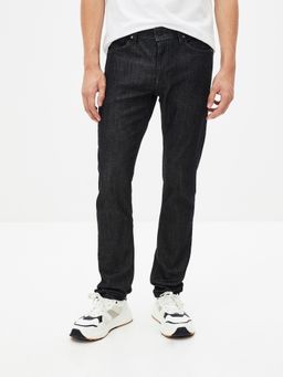 Džíny ve slim střihu. Pevný pas se zapínáním na zip a knoflík. Poutka na pásek. Standardních 5 kapes. Příjemný materiál s elastanem. Tmavě modrá barva s modrým prošitím.