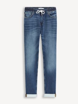 Džíny slim s pružným pasem. Džíny mají v pase poutka na pásek a stahovací šňůrku. Styl s 5 kapsami. Příjemný materiál s elastanem.