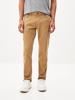 Bavlněné kalhoty s elastanem. Pohodlný straight střih. Klasických 5 kapes. Pevný pas se zapínáním na zip a knoflík. Poutka na pásek. Prošití tón v tónu.