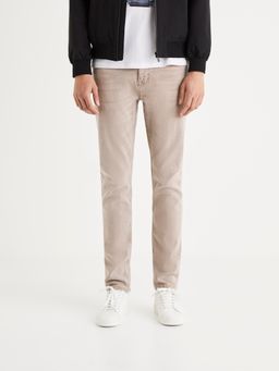 Džíny v béžové barvě. Klasické zapínání na zip a knoflík. Poutka na pásek. Přední i zadní kapsy. Rovný střih nohavic.