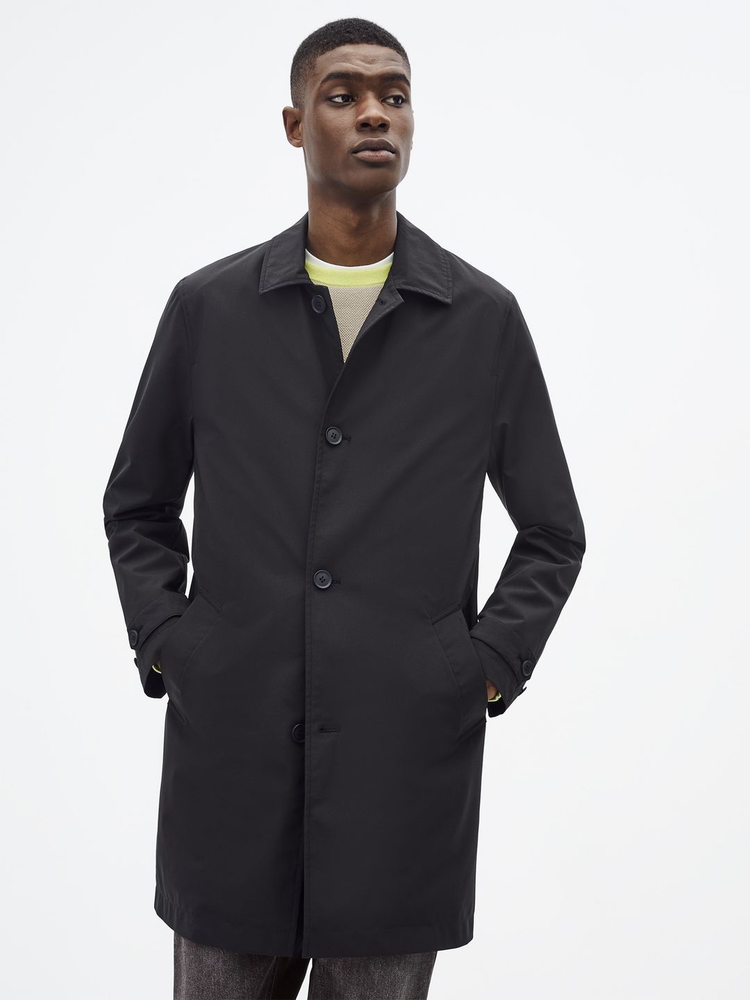 Elegantní kabát. Vodoodpudivý materiál. U krku límeček. Zapínání na knoflíky. Šikmé boční kapsy. Příjemný materiál s příměsí elastanu.
