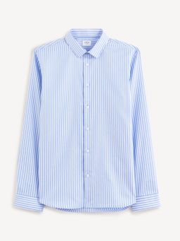 Pruhovaná košile. Slim střih. Drobný límeček se zapínáním na knoflíčky. Košile je celopropínací. Dlouhé rukávy s manžetou.