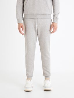 Tepláky v šedé barvě. Pružný pas se stahovací tkaničkou a falešný poklopec. Přední šikmé kapsy. Dlouhé nohavice s pružným nápletem. Na zadní straně našitá kapsa.