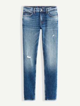 Klasické volnější džíny. Zapínání na zip a knoflík. Poutka na pásek. Přední a zadní kapsy. Obnošený vzhled. Hnědé prošití. Bavlněné s elastanem.