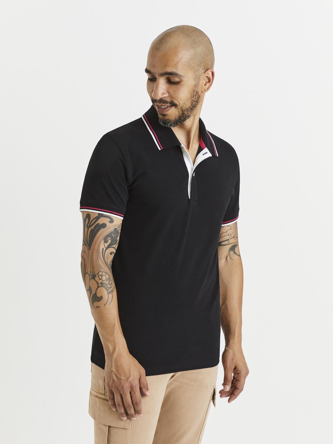 Polo tričko s barevným olemováním rukávů a límečku. Krátký rukáv a rovný střih. Drobná reliéfní struktura pique. Bavlněné s obsahem elastanu.