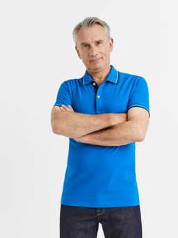 Polo tričko s barevným olemováním rukávů a límečku. Krátký rukáv a rovný střih. Drobná reliéfní struktura pique. Bavlněné s obsahem elastanu.