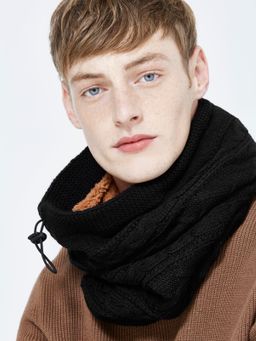 Pletený tunel s vnitřní stranou z fleecu. Stahovací šňůrka. Výrazný copánkový vzor. Obléká se přes hlavu.