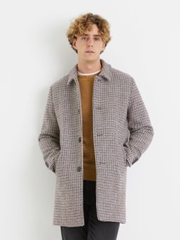 Kabát se zapínáním na knoflíky. U krku košilový límec. Šikmé boční kapsy. Hřejivý materiál s příměsí vlny.