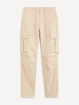 Bavlněné kalhoty s elastanem jsou velmi pohodlné a zároveň moderní. Kalhoty mají rovný lem nohavic a pevný pas s poutky na pásek. Zapínají se na zip a knoflík. Mají našité přední kapsy a na boku nohavic velké kapsy s klopou.