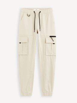 Sportovní natahovací kalhoty s kapsami s klopou. Přední boční kapsy a zadní kapsa s klopou. Jedna kapsa na zip. Pružný pas se stahovací šňůrkou. Zúžený střih nohavic a pružný lem. Příjemný materiál s elastanem.
