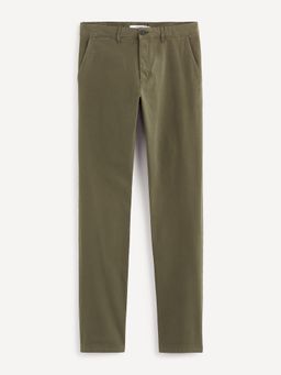 Jednobarevné kalhoty. Úzké chino nohavice z pružné bavlny v keprové vazbě. Kalhoty pro optimální pohodlí ve všech situacích. Pevný pas se zapínáním na zip a knoflík. Poutka na pásek. Přední šikmé kapsy. Zadní kapsy se zapínáním na knoflík. Tyto pánské kalhoty doporučujeme nosit k trendy tričku i košili s potiskem.