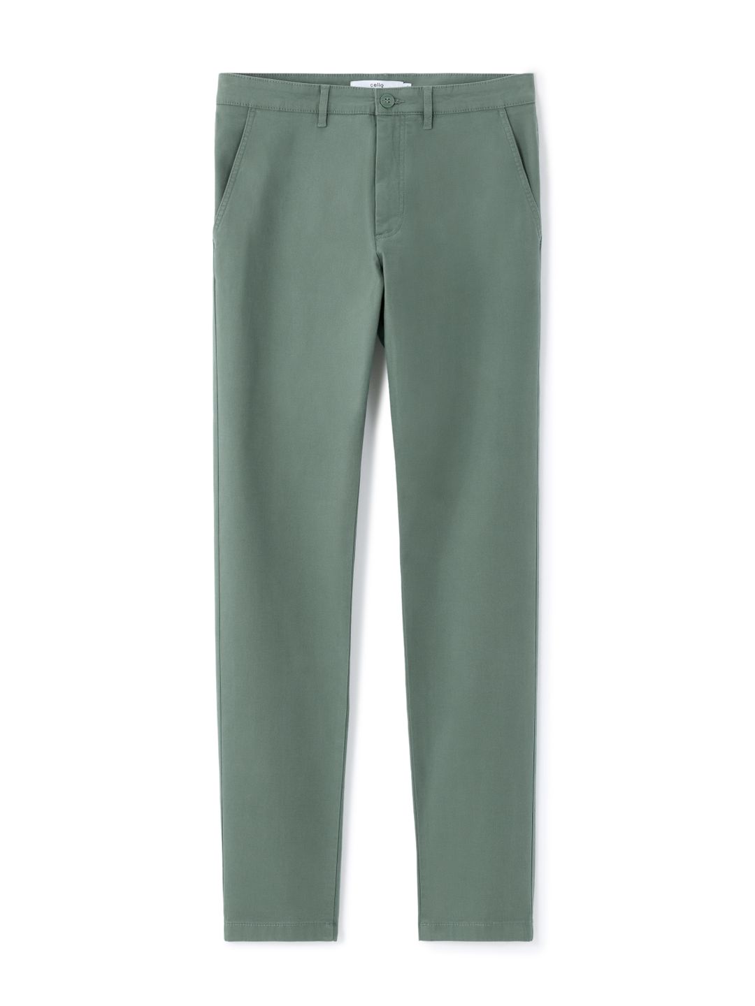 Jednobarevné kalhoty. Úzké chino nohavice z pružné bavlny v keprové vazbě. Kalhoty pro optimální pohodlí ve všech situacích. Pevný pas se zapínáním na zip a knoflík. Poutka na pásek. Přední šikmé kapsy. Zadní kapsy se zapínáním na knoflík. Tyto pánské kalhoty doporučujeme nosit k trendy tričku i košili s potiskem.